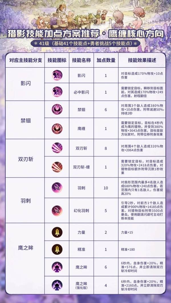 獵影的技能流派可以分為兩種,一個是以鷹纏為核心的強化PVP戰鬥能力的方向,主要是追擊和控制能力更強,技能很難被對手躲開;另一個則是無鷹纏的PVE戰鬥方向,更適用於靈活性較差的怪物目標,不用擔心怪物會躲開技能。